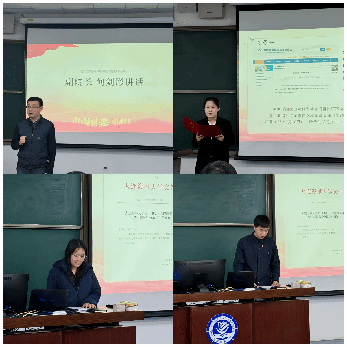 支部党员针对典型案例进行交流研讨。硕士研究生第一党支部纪检委员范凌瑞和硕士研究生第六党支部纪检委员李明锦作为代表进行发言,他们表示会带头恪守学术道德,严守科研底线,把诚信融入治学全过程。